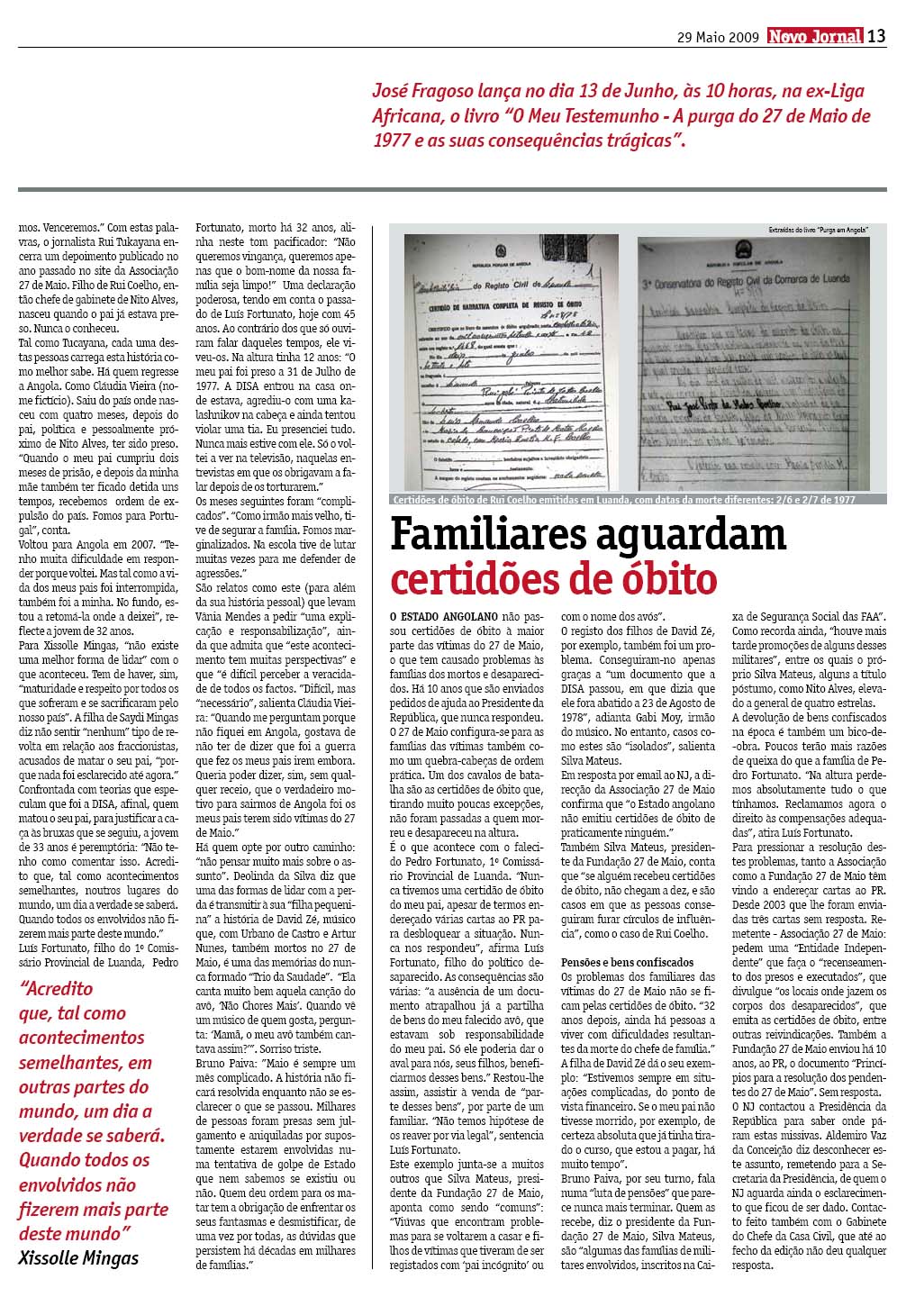Durante décadas, muitos dos filhos de angolanos mortos durante a purga de 27 de Maio de '77 viveram no total desconhecimento do verdadeiro motivo da morte dos seus pais. Traumatizadas pelas vivências de um dos períodos-tabú da nossa história, as famílias esconderam aos mais pequenos a verdade, para os proteger. 32 anos depois, os "filhos do 27 de Maio" exigem uma explicação do Estado angolano e do MPLA sobre o que aconteceu nos tempos seguintes ao 27/05. A resposta é a mesma de sempre - o silêncio.